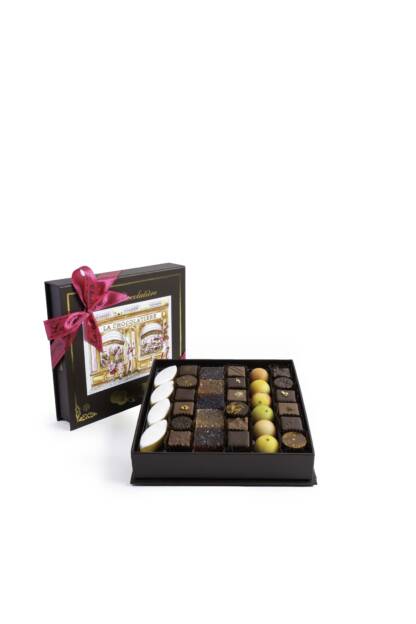 À l’image du magasin, ce coffret présente un assortiment de nos spécialités de chocolat et confiserie : bonbons de chocolat assortis ganaches et pralinés, pâtes de fruits, pâtes d’amande et calissons de Provence.