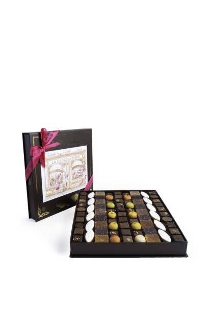 À l’image du magasin, ce coffret présente un assortiment de nos spécialités de chocolat et confiserie : bonbons de chocolat assortis ganaches et pralinés, pâtes de fruits, pâtes d’amande et calissons de Provence.