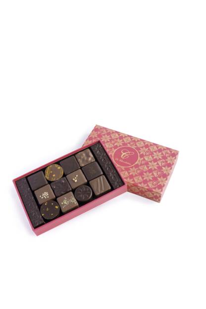 Cadeau délicat ou plaisir tout personnel, ce coffret paré d’un beau décor en dorure à chaud est composé de 12 bonbons de chocolat assortis (ganaches et pralinés) ainsi que de deux barres de chocolat noir 65 % pour encore plus de gourmandise !