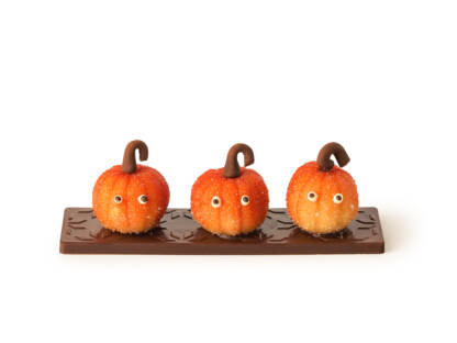 Ambiance Halloween avec ces 3 petites citrouilles en pâtes d’amandes peintes à la main sur un fond chocolat.