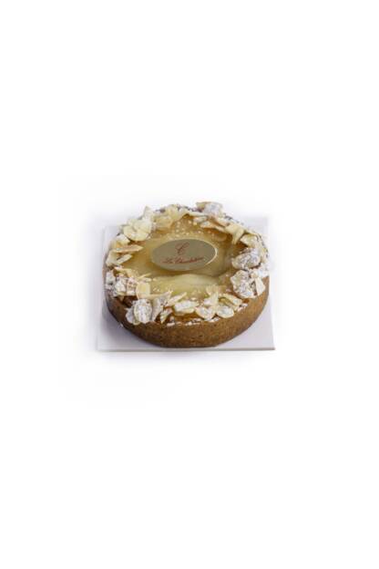 Pâte sucré, crème d’amande, poire, amandes effilées.